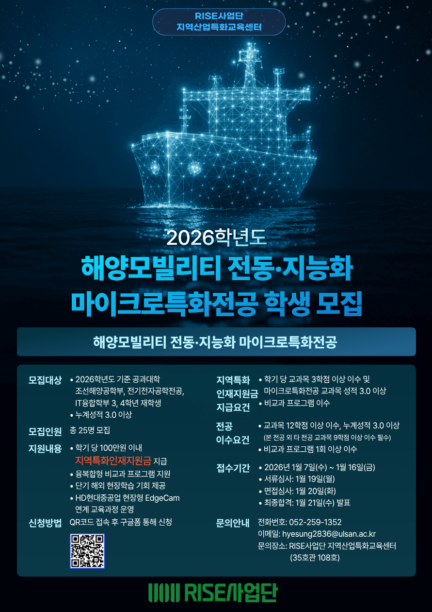 [RISE사업단] 해양모빌리티 전동·지능화 마이크로특화전공 학생 모집 안내